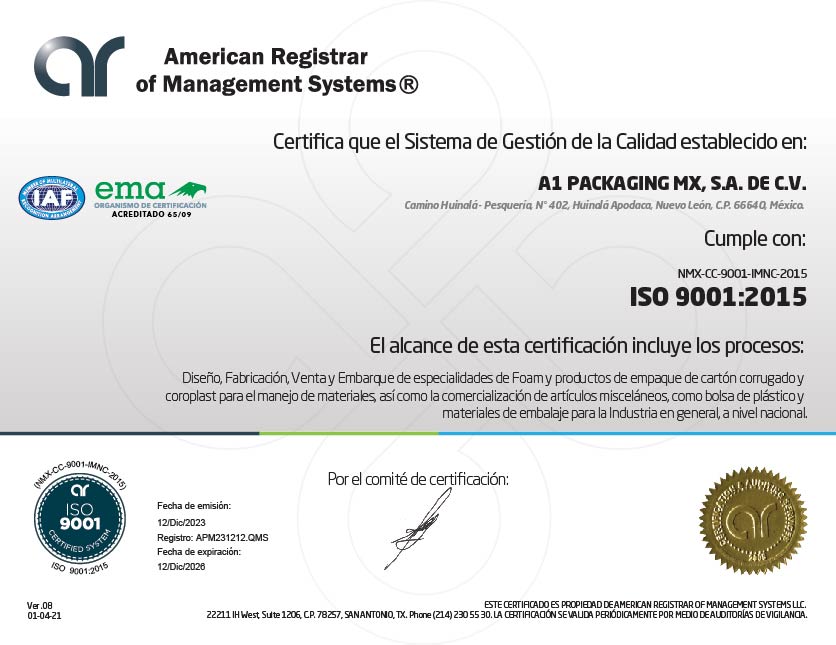 A1 PACKAGING MX está comprometido a satisfacer los requisitos de nuestros clientes, legales, reglamentarios y de las partes interesadas, mediante la capacitación de su personal y el trabajo en equipo, así como manufacturar y entregar a tiempo nuestros productos, garantizando el logro de los objetivos y la mejora continua del Sistema de Gestión de Calidad